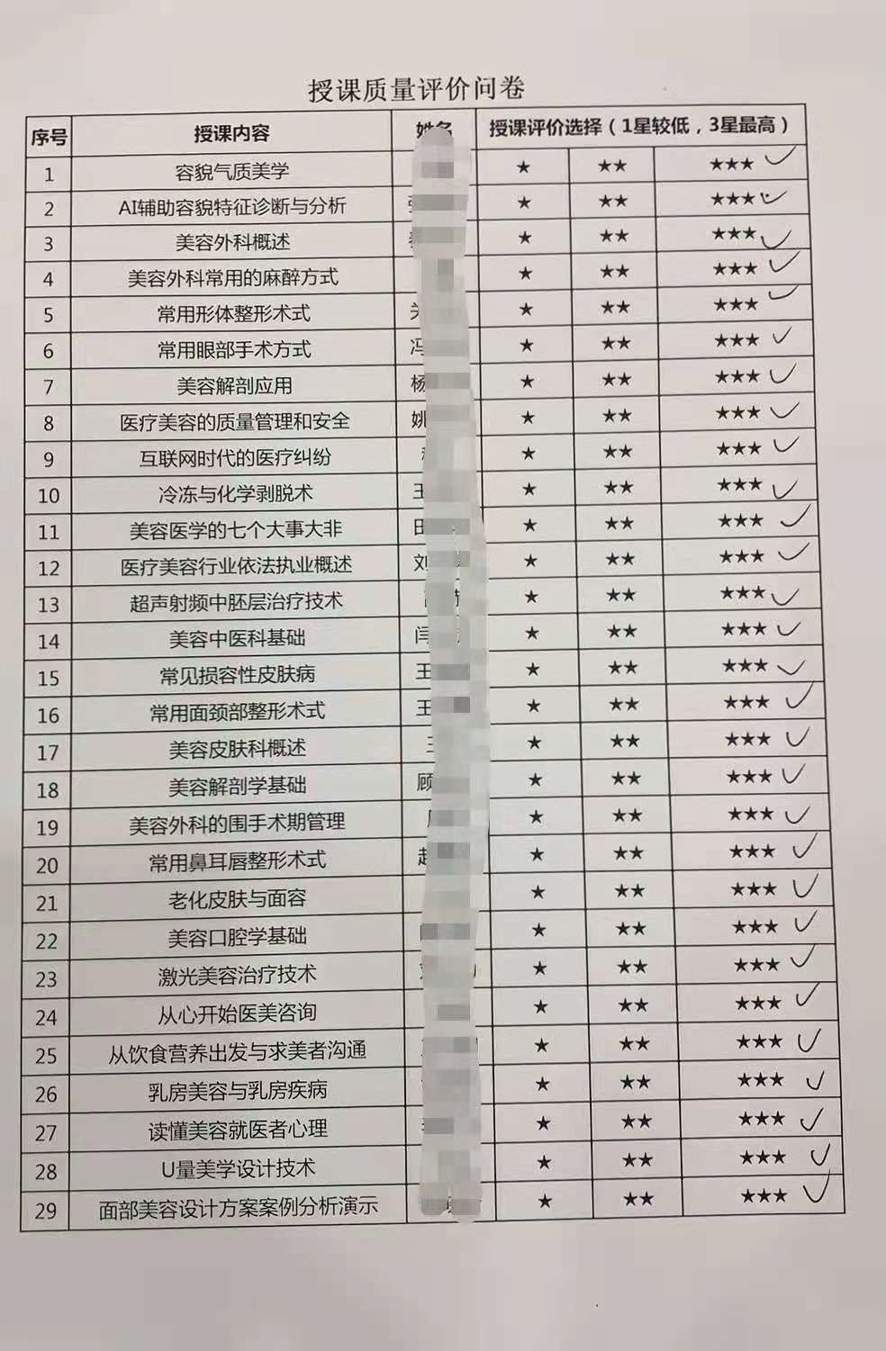 為了保證教學(xué)質(zhì)量,全國(guó)醫(yī)美規(guī)范培訓(xùn)除了有全國(guó)醫(yī)美教學(xué)督導(dǎo)介入檢查以外,學(xué)員還可以在課后按照不同標(biāo)準(zhǔn)對(duì)授課老師授課效果進(jìn)行評(píng)價(jià),評(píng)分較低的老師將會(huì)被要求改進(jìn)。